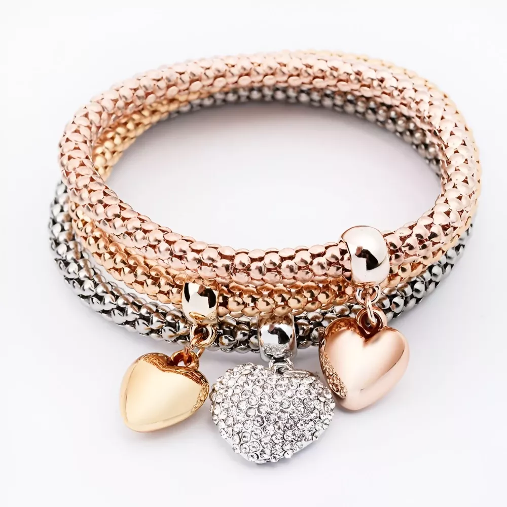 Celebrate love, charm, and style with this exquisite 3-piece Elastic Popcorn Beaded Bracelet Set. Designed in shimmering gold, silver, and rose tones, this set is the perfect accessory to elevate your look for any occasion. Each bracelet features a delicate symbol — a heart, butterfly, and anchor — representing love, freedom, and strength. Whether you wear them individually for a subtle touch or stack them together for a bold statement, these bracelets bring sparkle and meaning to your outfit.