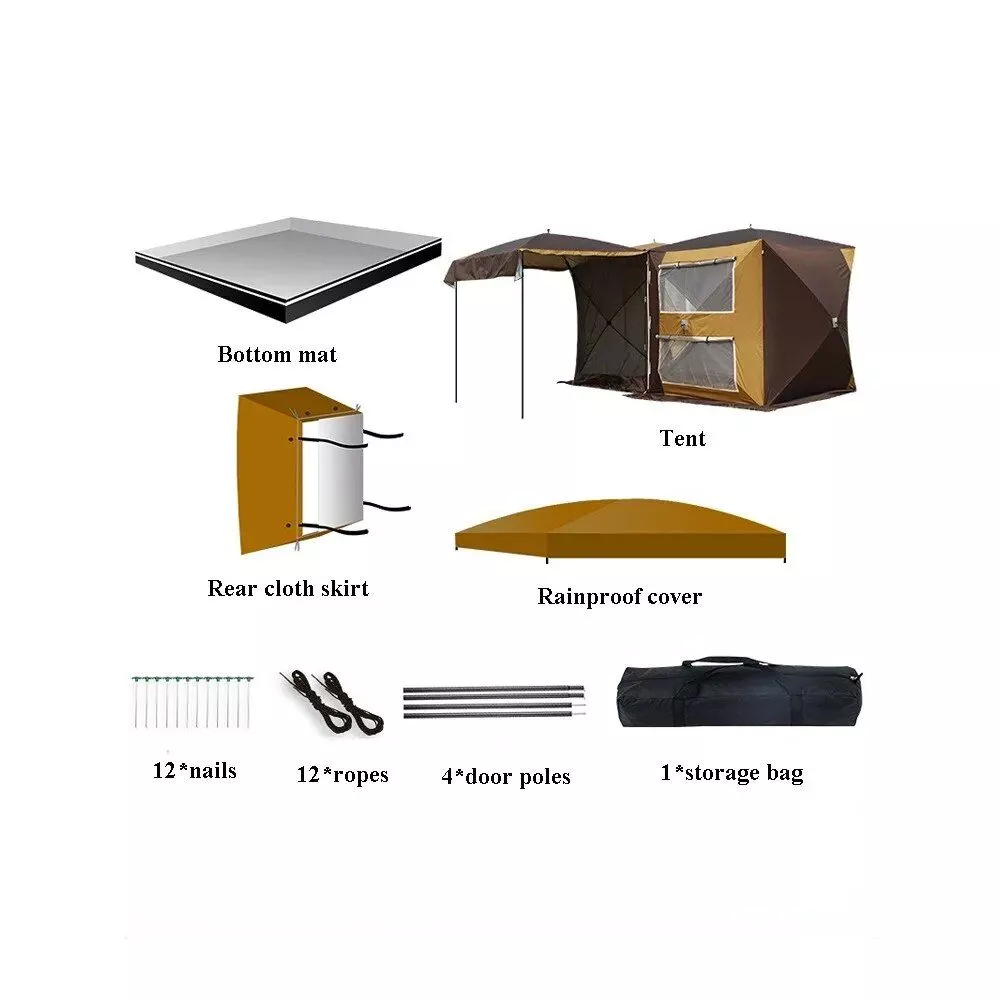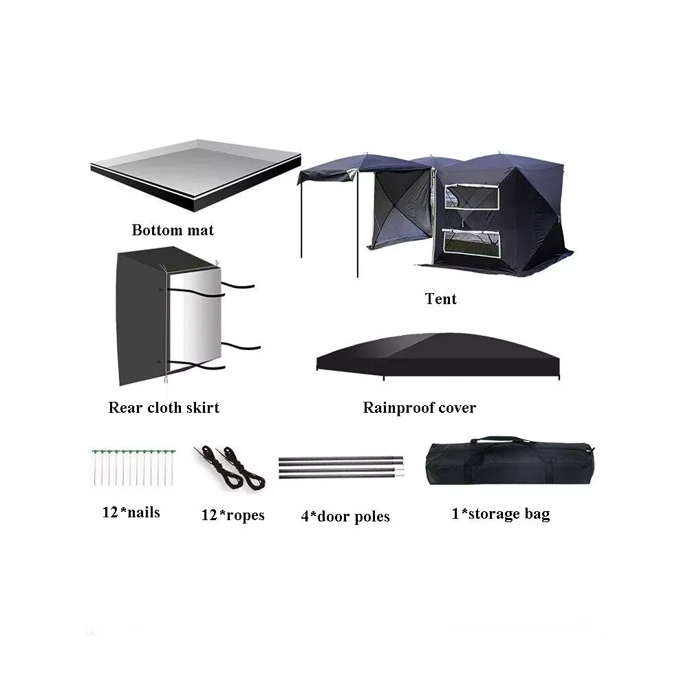 Our car tent stands out for its practical design and versatility. It’s perfect for self-driving tours, beach trips, and outdoor festivals. The tent provides a comfortable shelter, shielding you from the sun and rain, while its two-bedroom space structure offers privacy and comfort. Whether you’re seeking a weekend escape or an extended excursion, this tent is designed to enhance your outdoor experience.