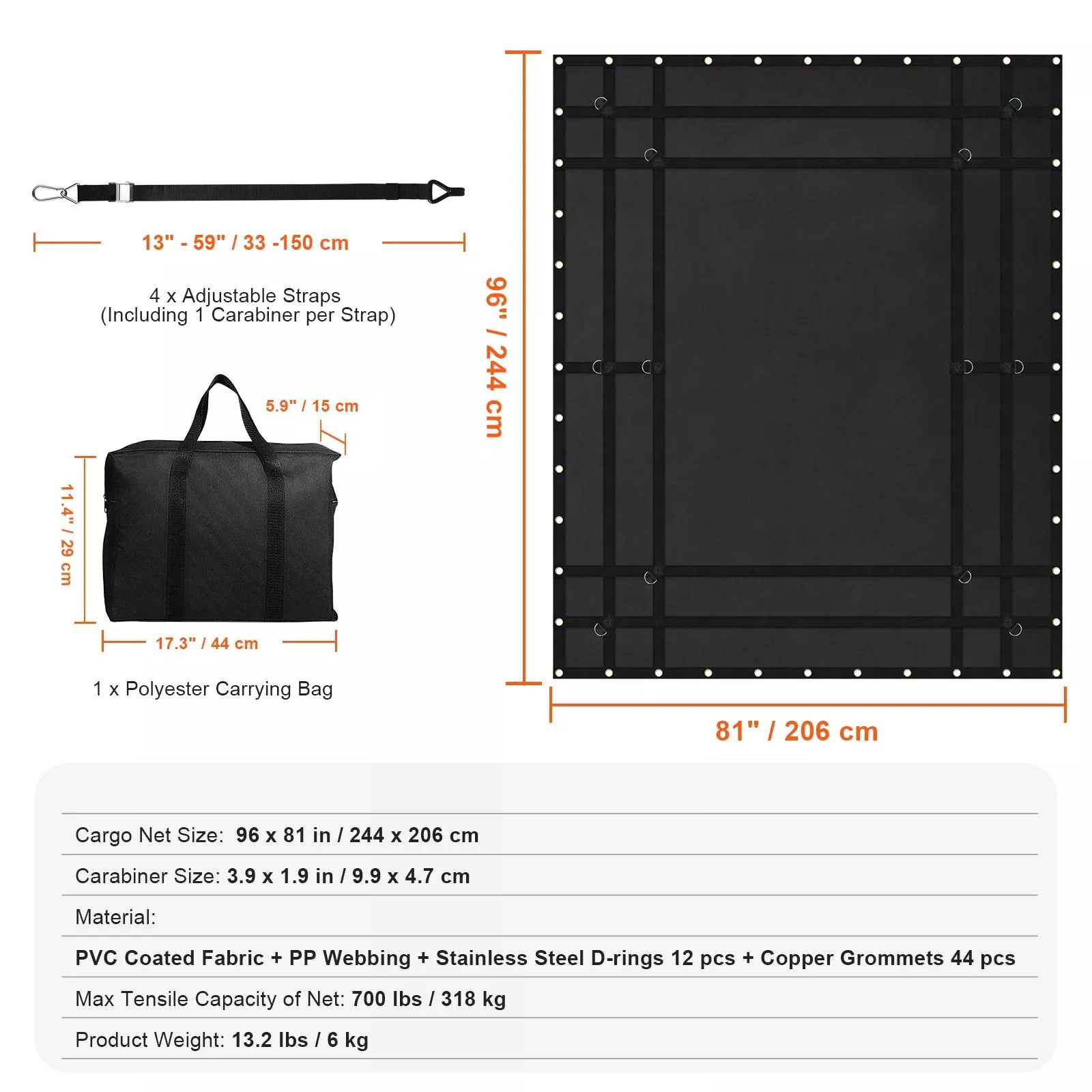 Crafted from high-strength PVC-coated fabric and reinforced with tear-resistant PP webbing, this cargo net delivers dependable performance in all weather conditions. It can hold up to 700 lbs and withstand wind, rain, and UV rays without weakening or fraying. Measuring 72″ x 57″, it offers wide coverage to keep both large and small items securely contained, preventing shifting or loss during transport.