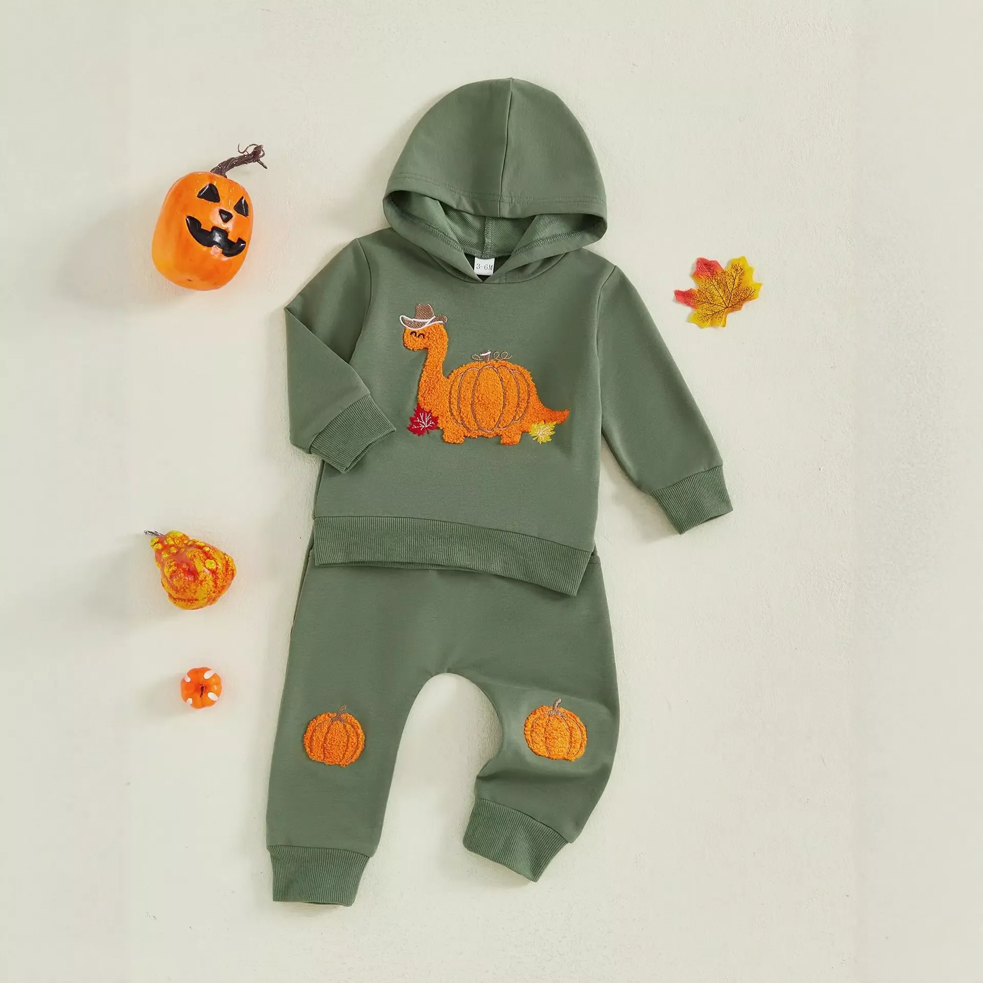 With a delightful combination of dinosaur and pumpkin embroidery on the hoodie, this outfit brings festive fun to life. The 3D-like detailing adds a touch of playfulness, giving your little one a standout Halloween look without being too spooky. It’s the perfect mix of sweet and seasonal—ideal for parties, playdates, or cozy days at home.