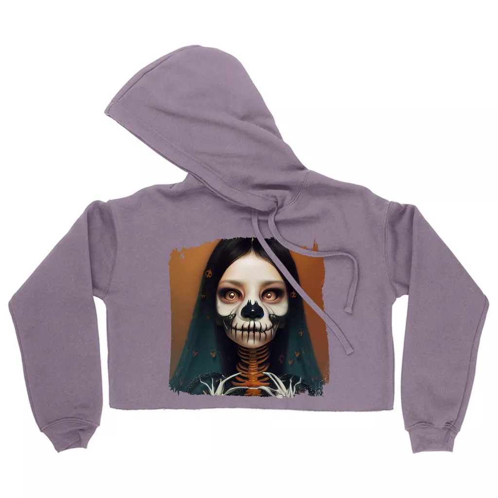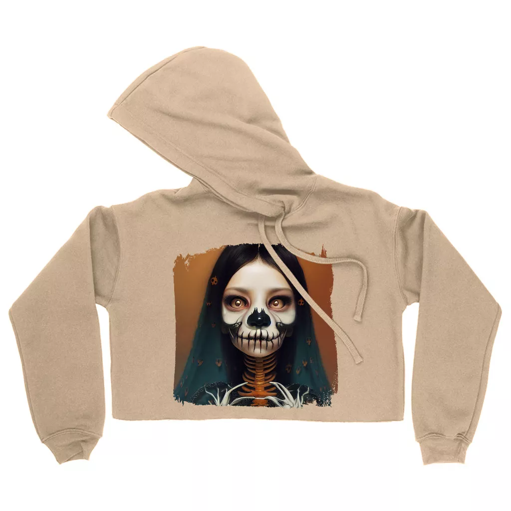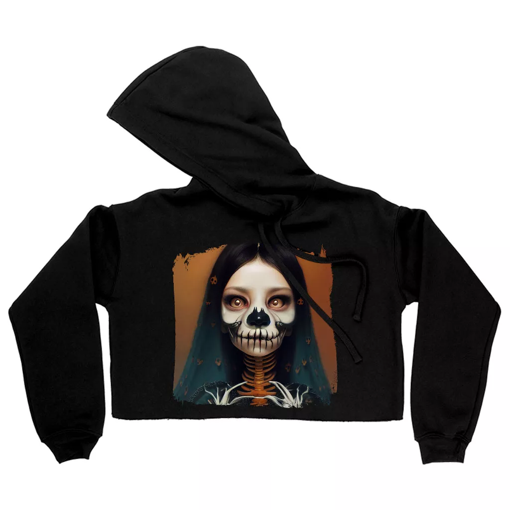 Creepy Girl Women’s Cropped Fleece Hoodie – Gothic Print Cropped Hoodie for Women – Skeleton Hooded Sweatshirt