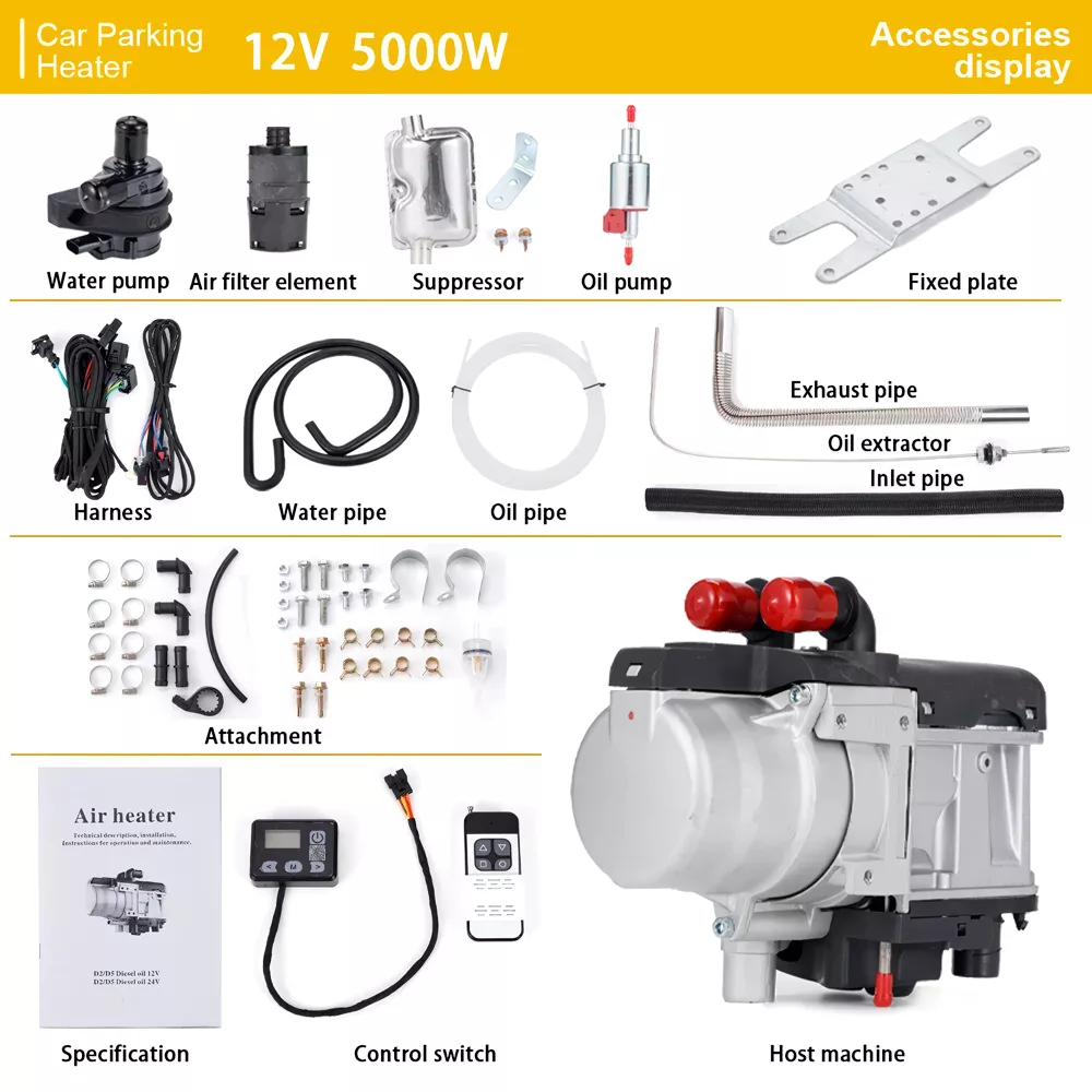 Our heater stands out due to its dual functionality as an air and water heater, coupled with its user-friendly LCD remote control. This combination offers unparalleled convenience and efficiency, ensuring your vehicle is always warm and ready to go. Whether you’re using it for auxiliary heating during drives or for parking heating, this heater guarantees performance and comfort.
