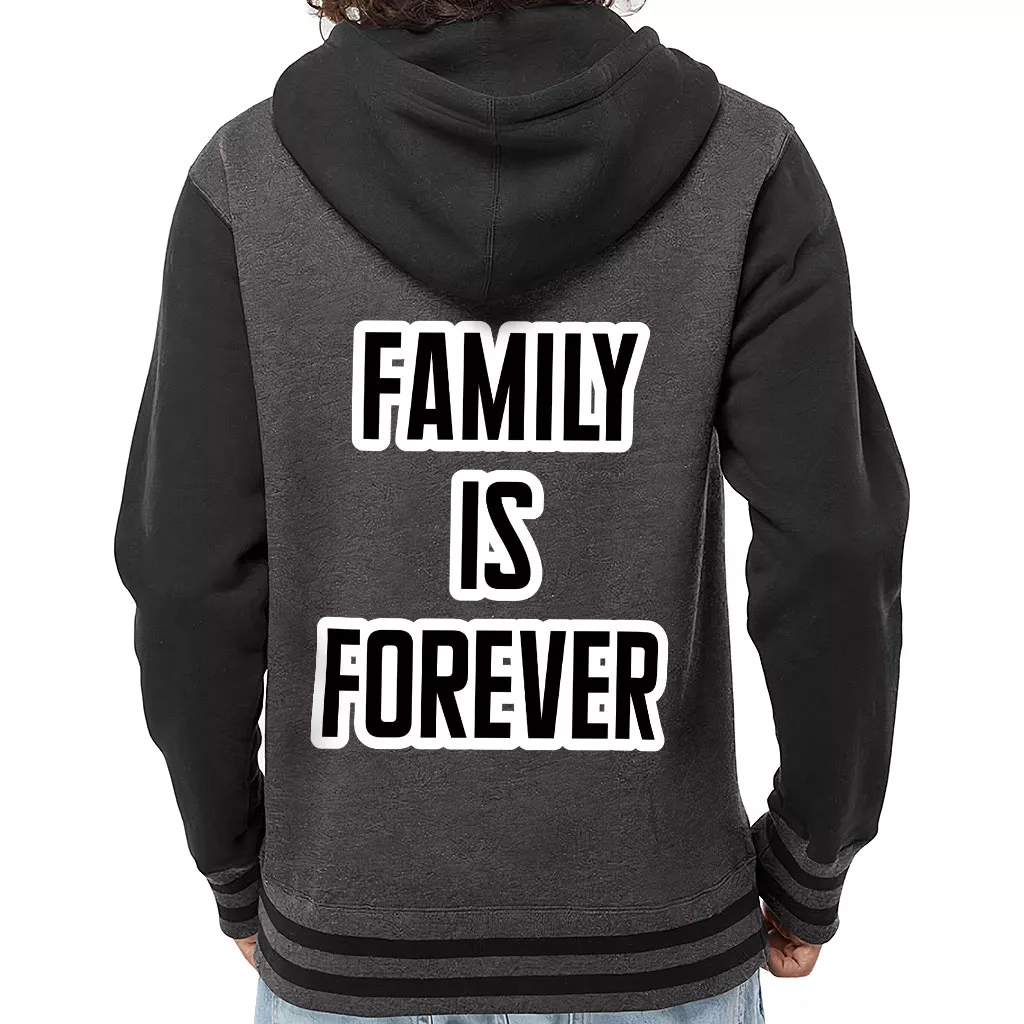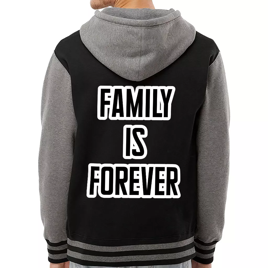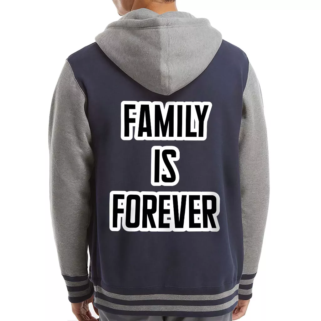 An essential closet staple, Family is Forever Varsity Hoodie is a go-to classic for hiking, training, or just kicking back. Pair it with your favorite shorts, athletic pants, jeans, or any pants you like.