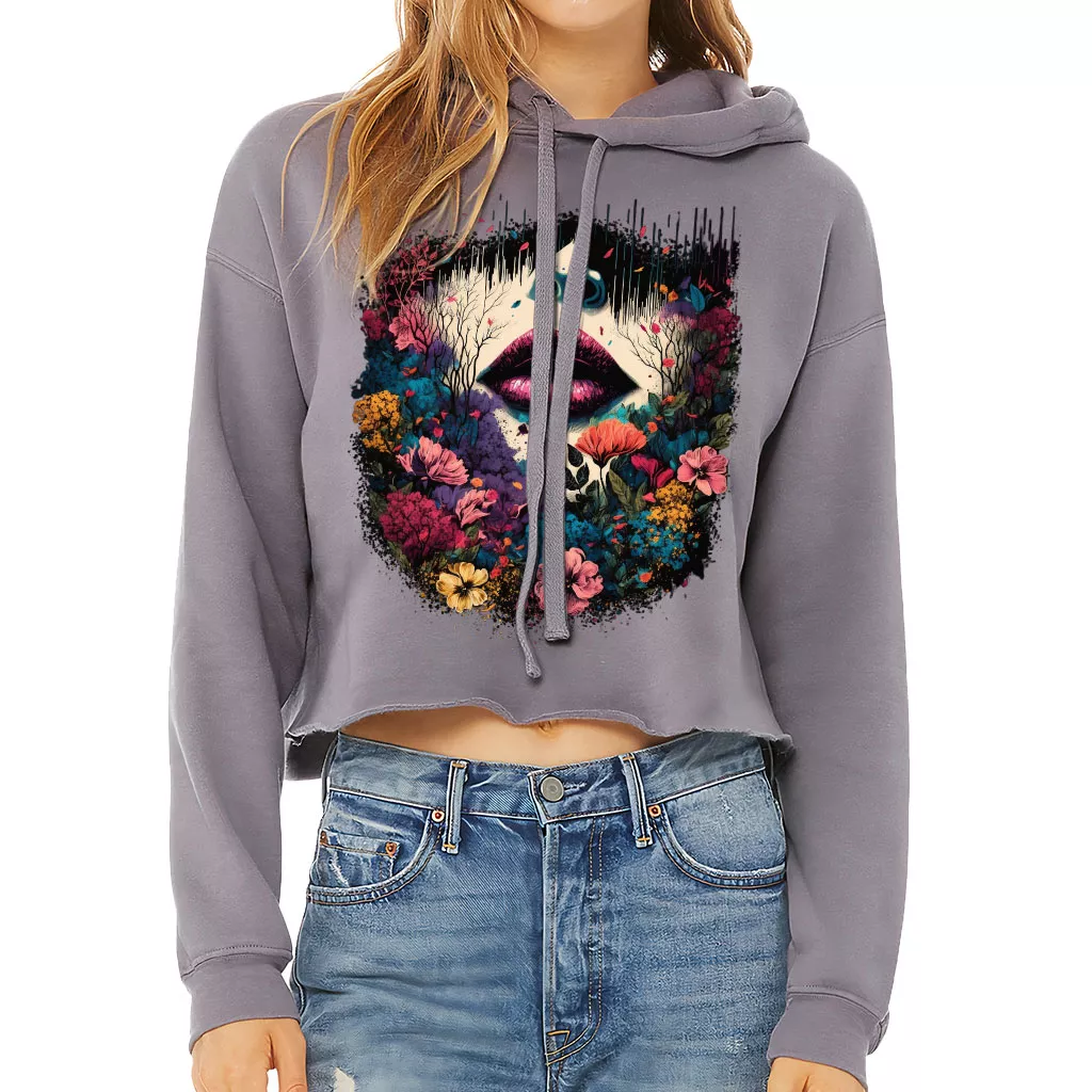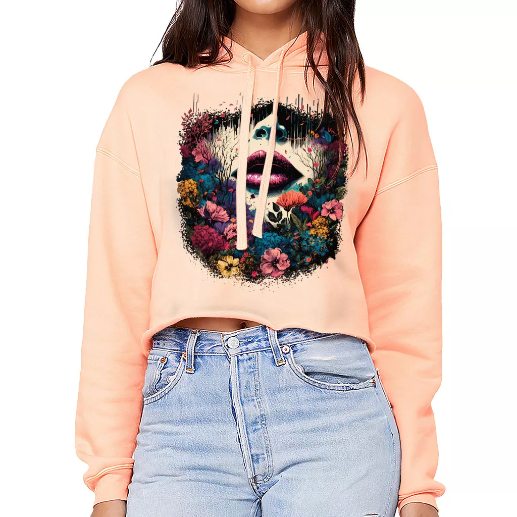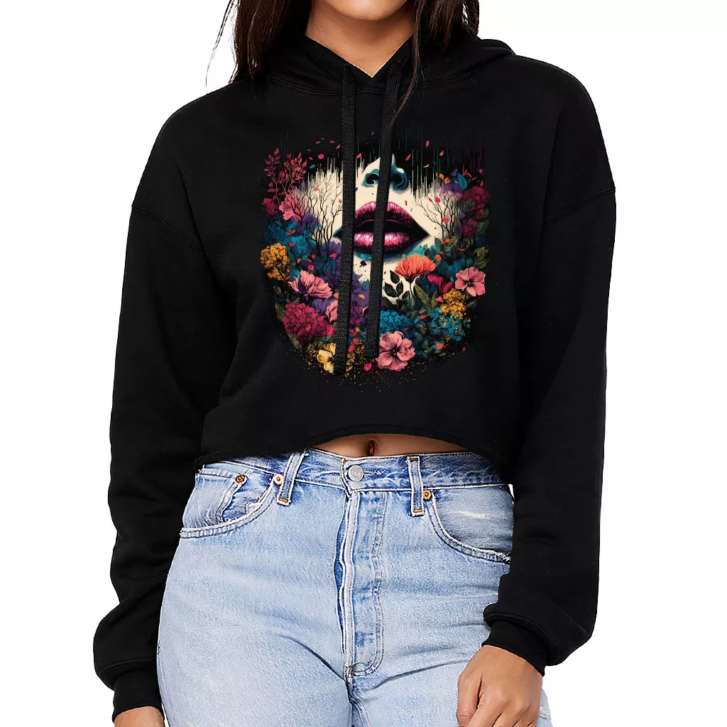 Flower Design Women’s Cropped Hoodie – Lips Cropped Hoodie – Illustration Hooded Sweatshirt