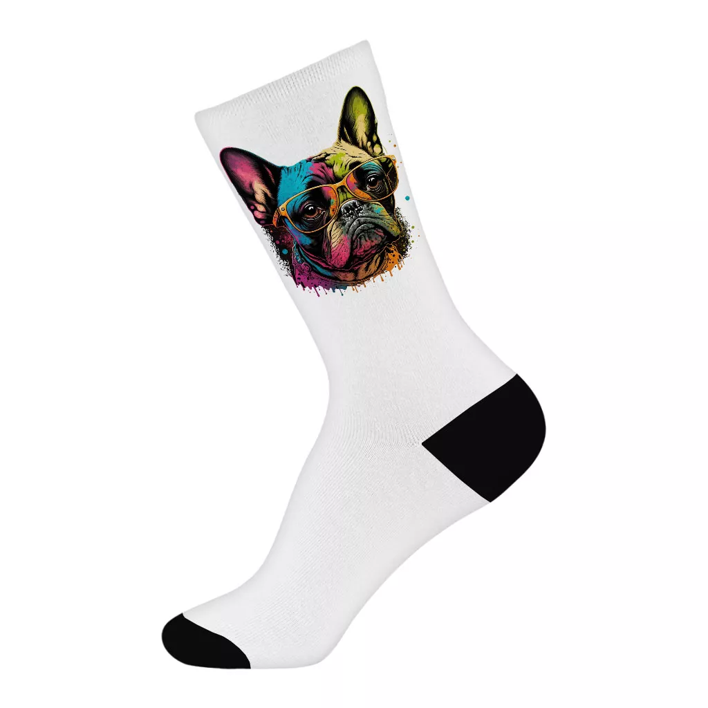 French Bulldog Socks – Dog With Glasses Novelty Socks – Colorful Crew Socks