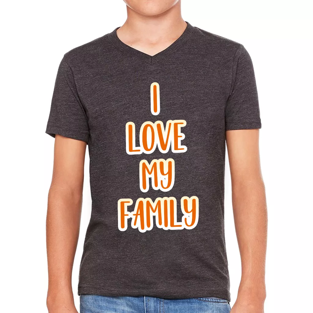 I Love My Family Kids’ V-Neck T-Shirt fits like a well-loved favorite, featuring a classic V-neck, short sleeves, and the softest superior Airlume combed and ring-spun cotton that feels great all day long.