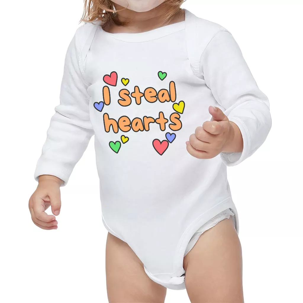 I Steal Hearts Baby Long Sleeve Onesie is made of high-quality fabric which makes it soft on the skin, breathable, lightweight, and comfortable to wear. Made of high-end materials, with sturdy stitching and non-fade colors, these bodysuits are extra-durable.