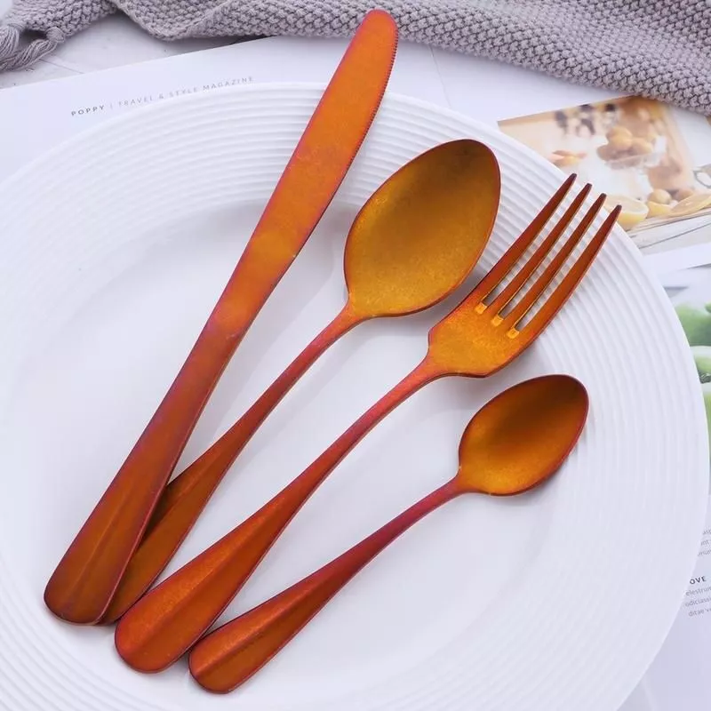 Our cutlery set includes a dining knife, fork, spoon, and tea spoon, all weighing a comfortable 233g per set. The solid pattern and pigmented technique give it a unique aesthetic appeal, perfect for modern Western-style dining.