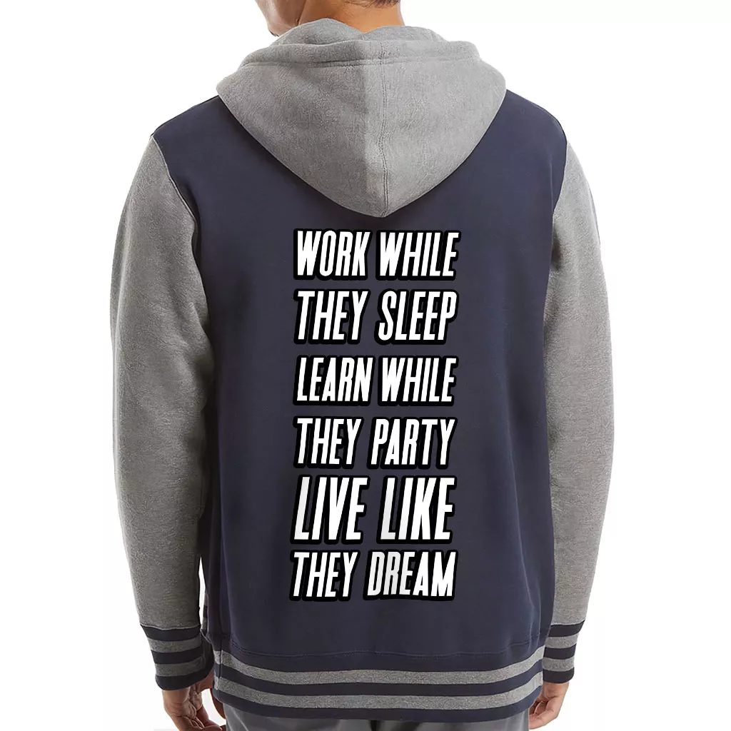 An essential closet staple, Motivational Quote Varsity Hoodie is a go-to classic for hiking, training, or just kicking back. Pair it with your favorite shorts, athletic pants, jeans, or any pants you like.