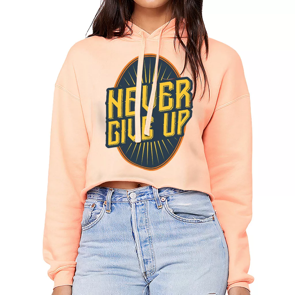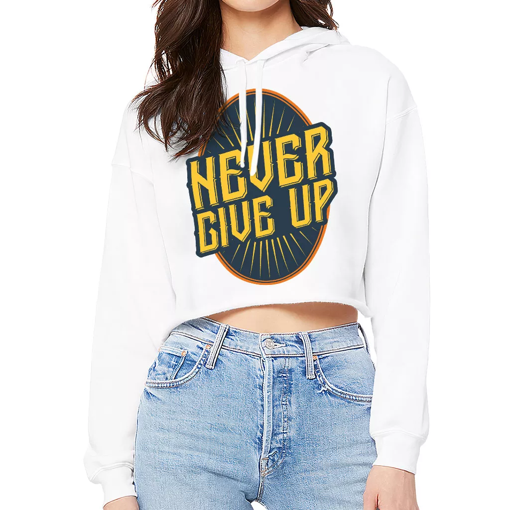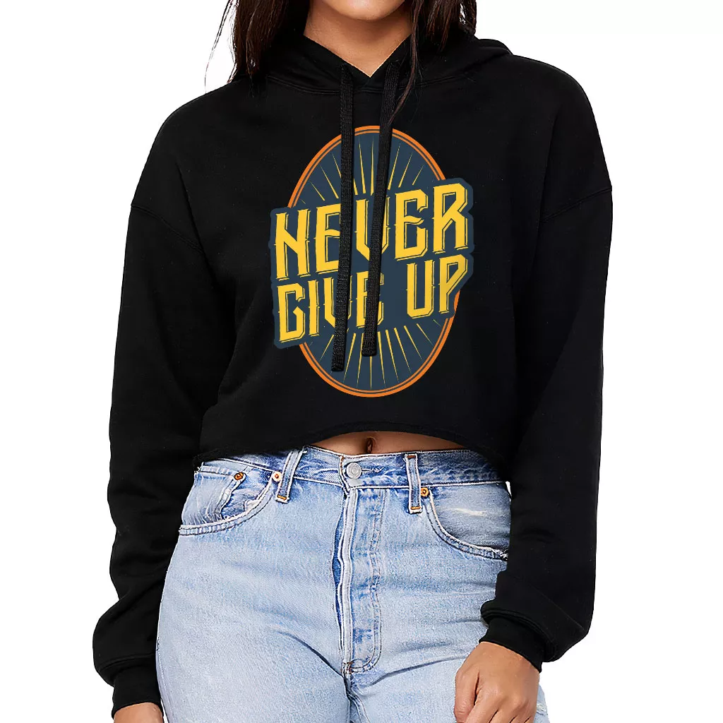 Never Give Up Women’s Cropped Hoodie is proudly made with 7x less water than average manufacturers, in recycle-friendly facilities that also guarantee zero sweatshop conditions. Motivational is designed and printed in California.