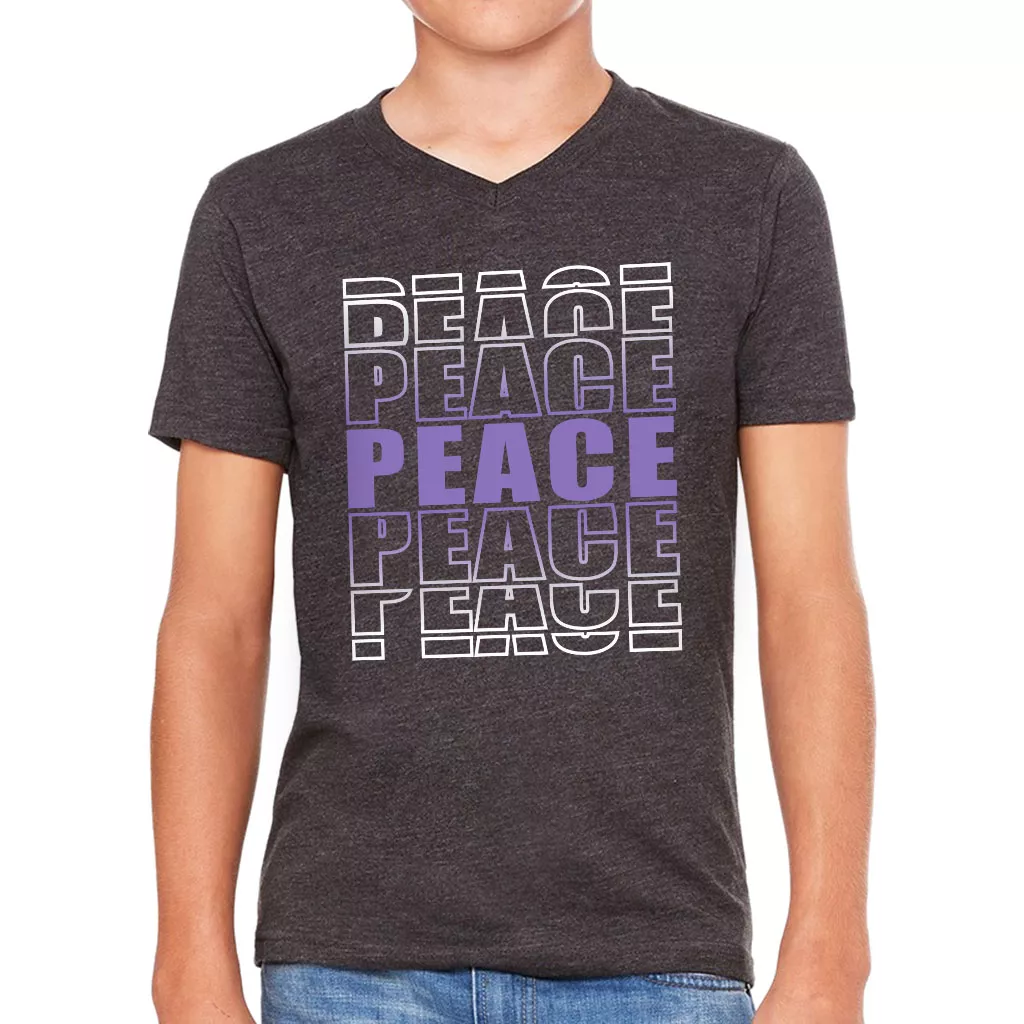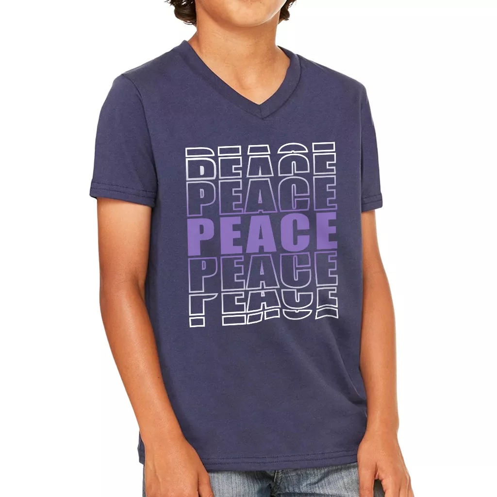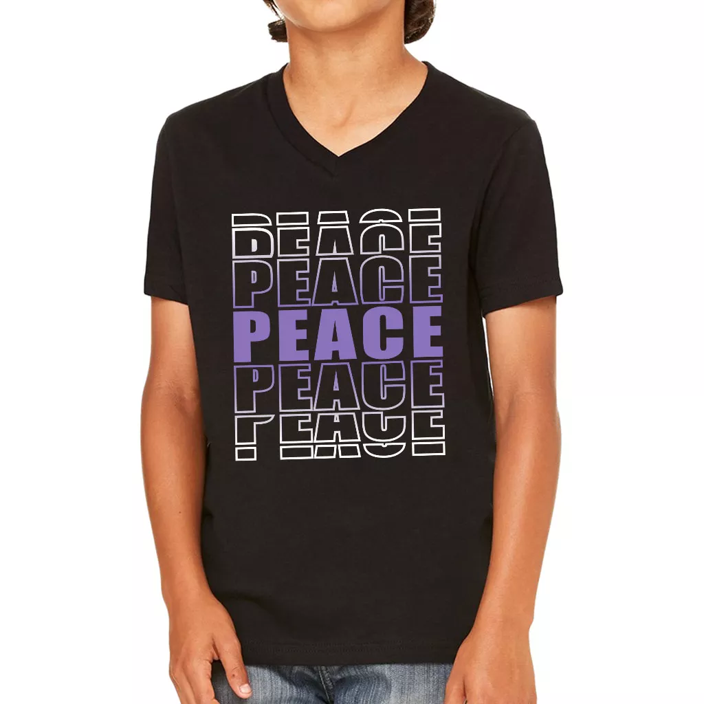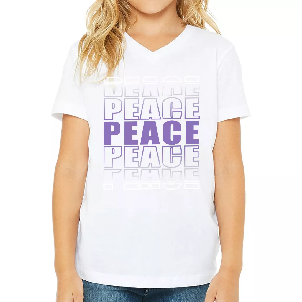 Peace Kids’ V-Neck T-Shirt fits like a well-loved favorite, featuring a classic V-neck, short sleeves, and the softest superior Airlume combed and ring-spun cotton that feels great all day long.