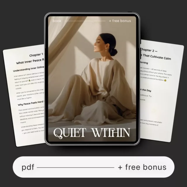 If your mind feels busy, heavy, or constantly “on,” this ebook is your invitation to slow down. Quiet Within is a gentle yet practical guide designed to help you create calm in a noisy world. Instead of unrealistic promises, it offers small, doable steps that fit into real life. You’ll learn how to find inner peace without escaping your responsibilities, isolating yourself, or overcomplicating the process. This digital guide works for modern life — busy schedules, emotional overwhelm, and constant digital distractions included.