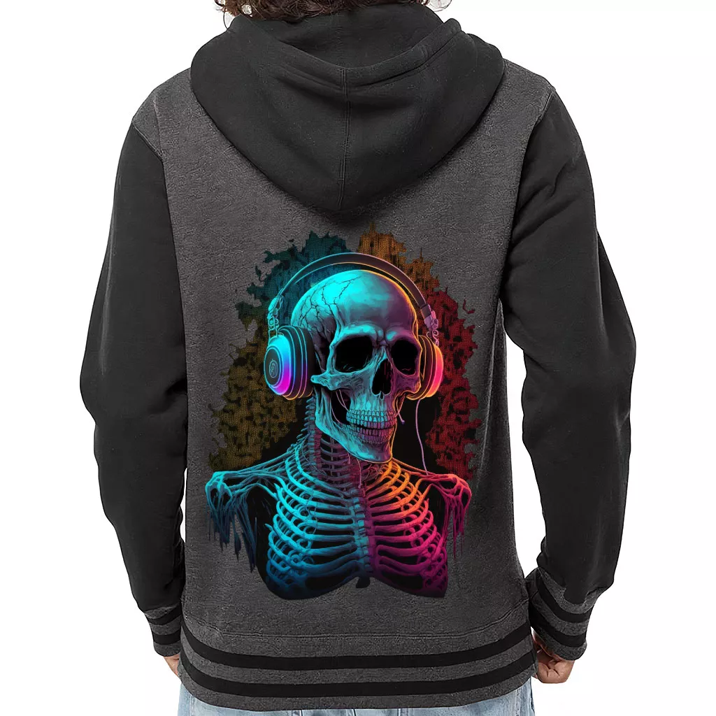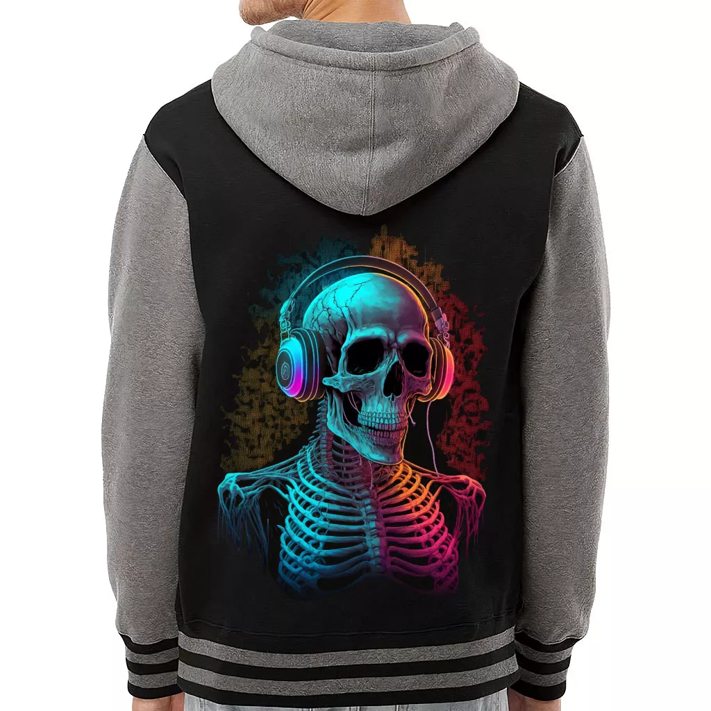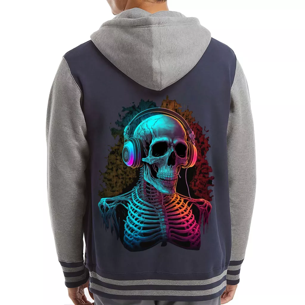 An essential closet staple, Skeleton With Headphones Varsity Hoodie is a go-to classic for hiking, training, or just kicking back. Pair it with your favorite shorts, athletic pants, jeans, or any pants you like.