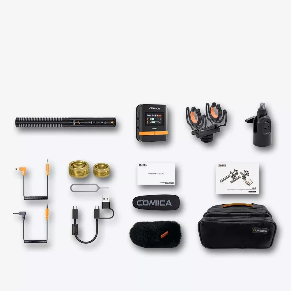 This powerful microphone system features a dual-channel wireless setup with a 2.4GHz stable transmission, giving you a working range of up to 650 ft (200 m) with ultra-low latency under 20 ms. The 14mm gold-plated condenser capsule captures rich, detailed sound, while the built-in 32G onboard memory provides up to 40 hours of recording storage. The exclusive Comica Audio App offers additional control and customization for denoise, low-cut, and high-frequency boost functions. An easy-to-read OLED display keeps you in command of every recording situation.