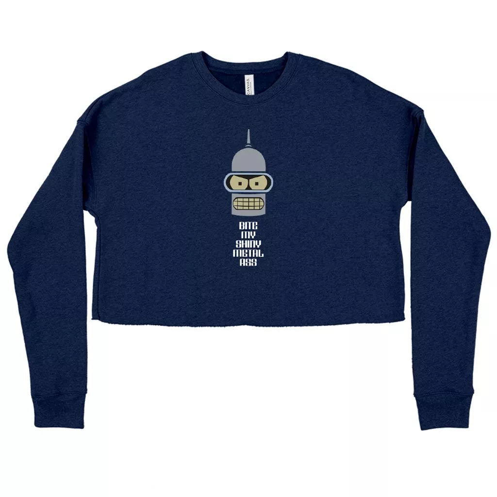 Women’s Cropped Fleece Bite My Shiny Metal Ass Sweatshirt – Bender Sweatshirt – Futurama Sweatshirt